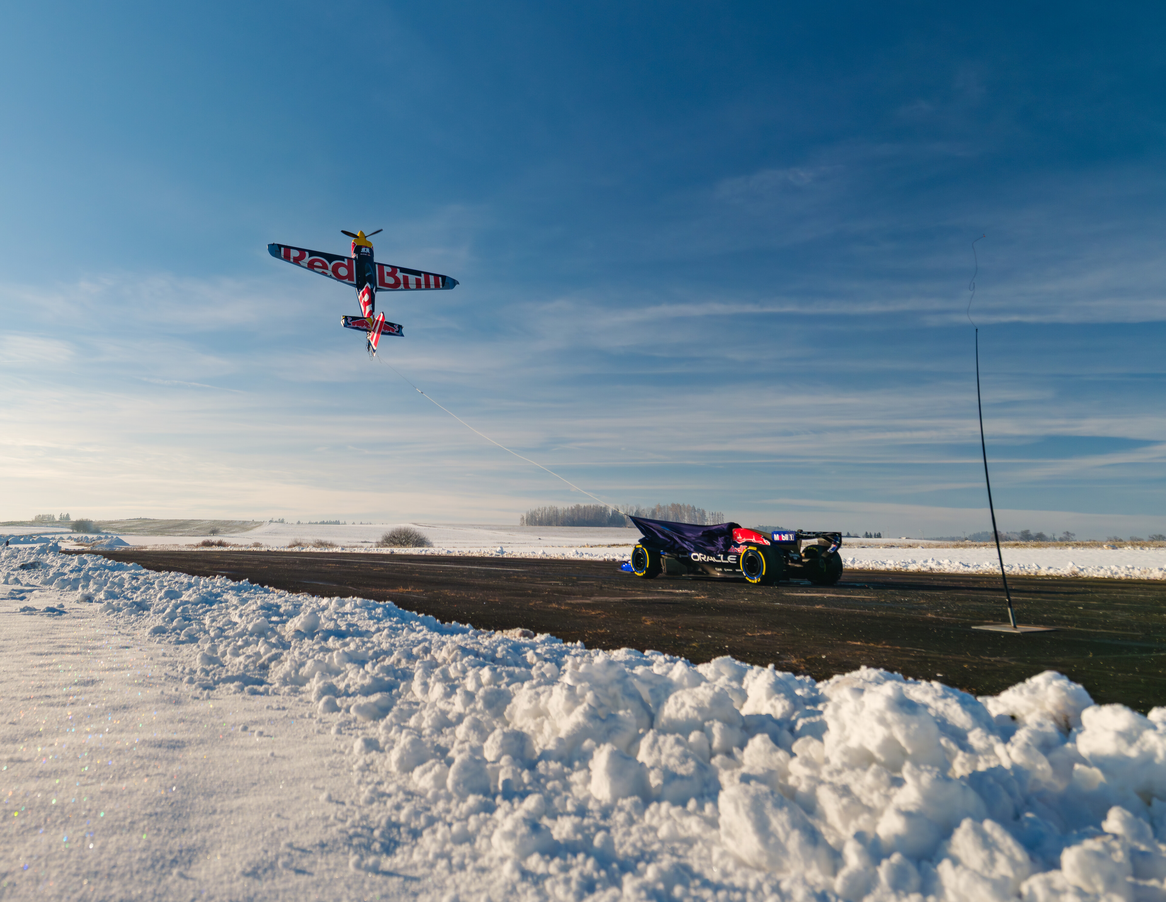 „Klíčem byla precizní koordinace směru, rychlosti a výšky. Pokud bych manévr zahájil jen o dvě až tři desetiny sekundy chybně, hrozil by náraz ocasní částí letadla přímo do vozu F1,“ popsal náročnost akce rodák z Dvora Králové nad Labem.