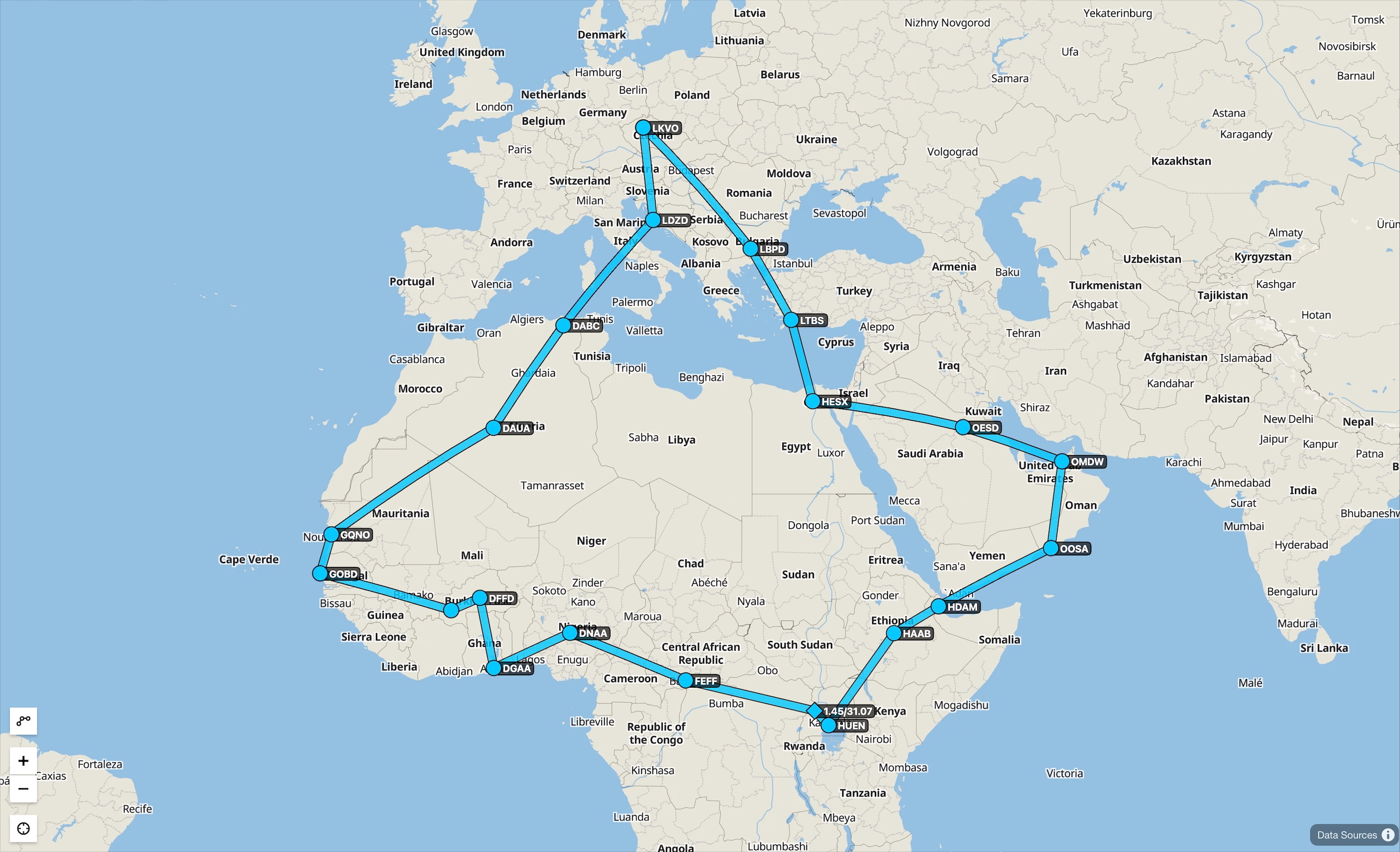 Země s mezipřistáním: Bulharsko, Turecko, Egypt, Saúdská Arábie, SAE, Omán, Džibutsko, Etiopie, Uganda, Středoafrická republika, Nigérie, Ghana, Burkina Faso, Senegal, Mauritánie, Alžírsko a Chorvatsko